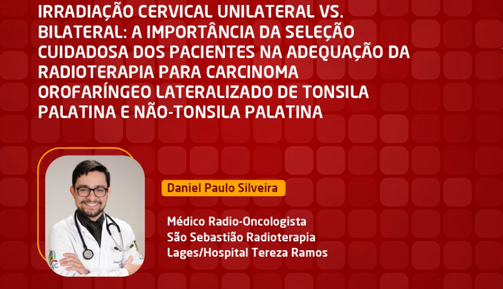 Objetivo: avaliar os desfechos oncológicos da radioterapia cervical unilateral versus bilateral para carcinoma orofaríngeo (COF) bem lateralizado, incluindo tumores de tonsilas palatinas e não-tonsilares (lateralizados de base de língua, valécula e palato mole). Pacientes: COF cT1-3 N0-2bM0 (TNM-7), tratados com radioterapia curativa (quimioterapia concomitante ou não) em 2 instituições do Canadá: Princess Margaret e British Columbia Cancer Agency (2008-2019). Radioterapia