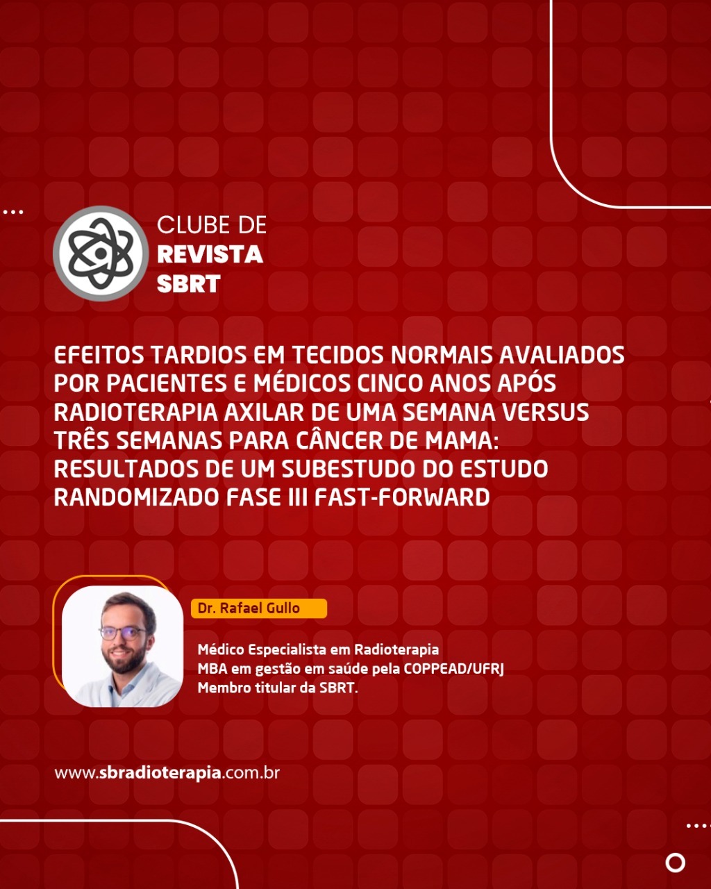 Médico Especialista em Radioterapia, MBA em gestão em saúde pela COPPEAD/UFRJ, membro titular da SBRT.