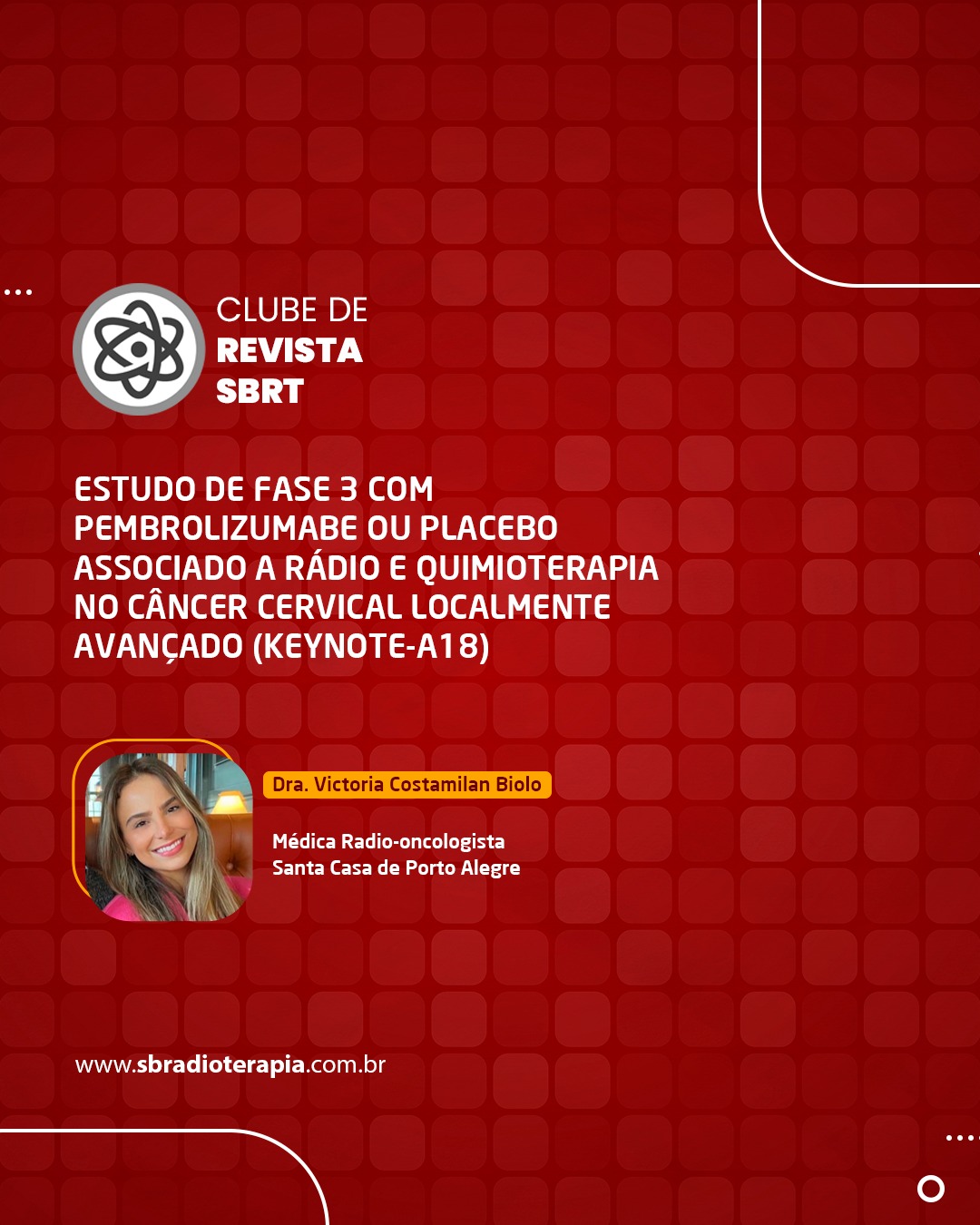 O estudo de fase 3 KEYNOTE-A18 (ENGOT-cx11/GOG-3047), randomizado e duplo-cego, avaliou a adição de pembrolizumabe à quimiorradioterapia no cenário curativo. Foram incluídas 1.060 pacientes com câncer de colo uterino recém-diagnosticado em estágios IB2 a IVA (FIGO 2014), randomizadas para receber quimiorradioterapia associada a pembrolizumabe ou placebo (5 ciclos a cada 3 semanas), seguidos de tratamento adjuvante com pembrolizumabe ou placebo por até 15 ciclos (a cada 6 semanas).