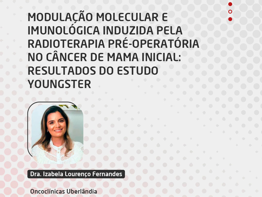 O estudo YOUNGSTER investigou os efeitos moleculares e imunológicos da radioterapia pré-operatória em câncer de mama inicial, com o objetivo de caracterizar sua capacidade de modular o microambiente tumoral e potencializar estratégias combinadas. Foram incluídas 20 pacientes candidatas à cirurgia conservadora, submetidas a um boost pré-operatório de radioterapia (5 × 2,67 Gy), com coleta seriada de amostras tumorais no baseline, 3–5 dias após a irradiação e no espécime cirúrgico. A análise integrou perfil de expressão gênica (painel de 192 genes), imunohistoquímica para Ki67 e CD68, quantificação de linfócitos infiltrantes tumorais e avaliação de dano ao DNA por γH2AX.