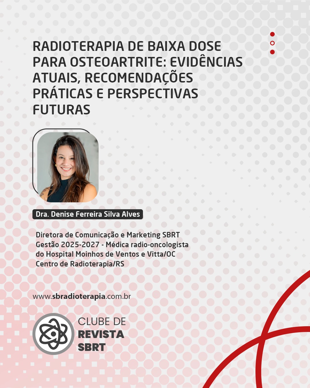 Esta revisão narrativa reúne evidências atuais, recomendações práticas e perspectivas futuras sobre o uso da radioterapia em baixa dose (low-dose radiotherapy – LDRT) no tratamento da osteoartrite (OA), incluindo uma análise crítica de estudos considerados negativos.