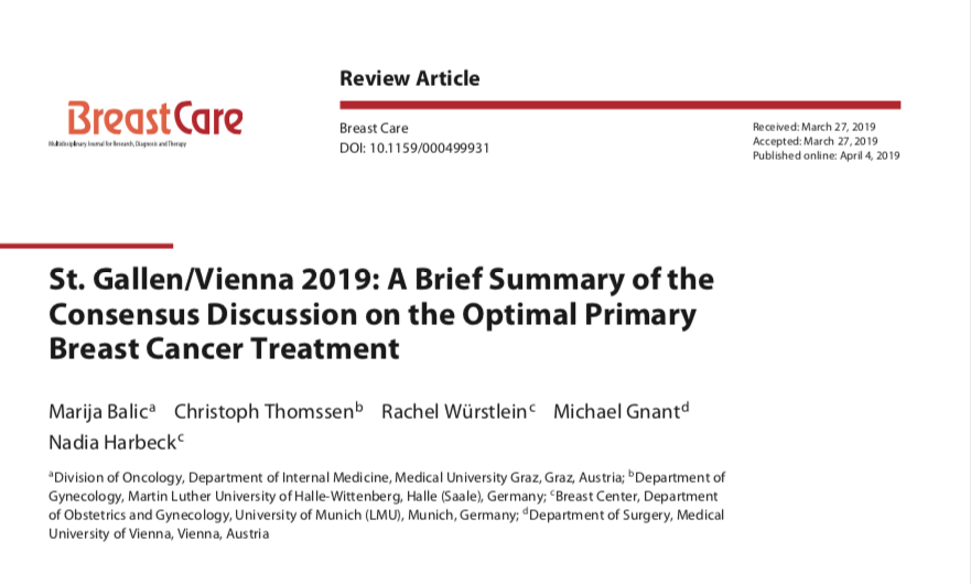 No último dia 04 de abril, foi publicado, na Revista BreastCare, um “briefing” de atualização do Consenso de St. Gallen ocorrido em Vienna – Aústria, de 20 a 23/03/2019, para o tratamento locorregional e sistêmico do câncer de mama.