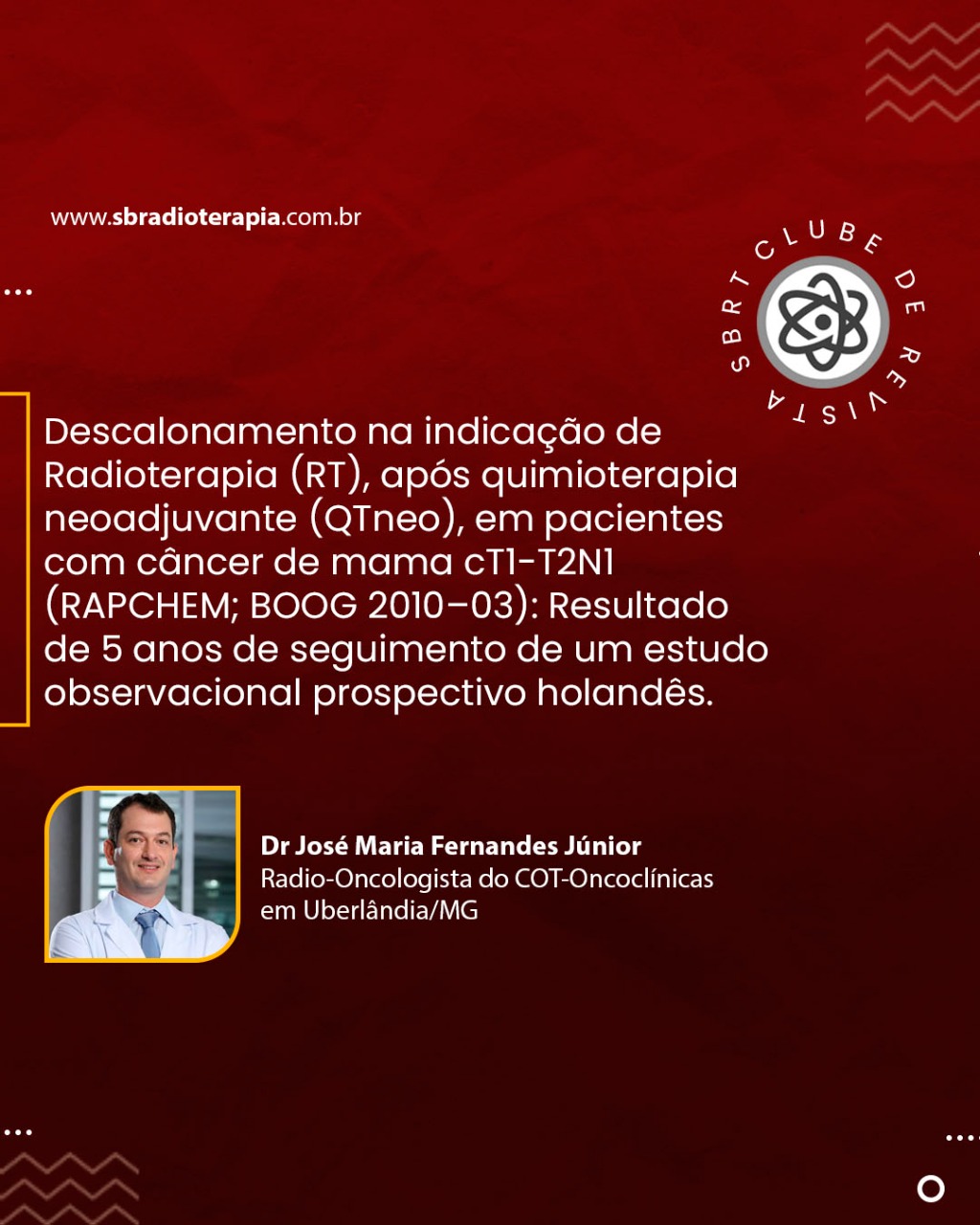 No contexto da QTneo para tratamento de câncer de mama, há um dilema em relação à indicação da RT adjuvante, já que os guidelines clássicos são baseados nos resultados histopatológicos de pacientes tratados com cirurgia primariamente. Este estudo propõe observar a segurança oncológica de descalonamento da Radioterapia locoregional em pacientes com cT1-2N1, tratados com QTneo.