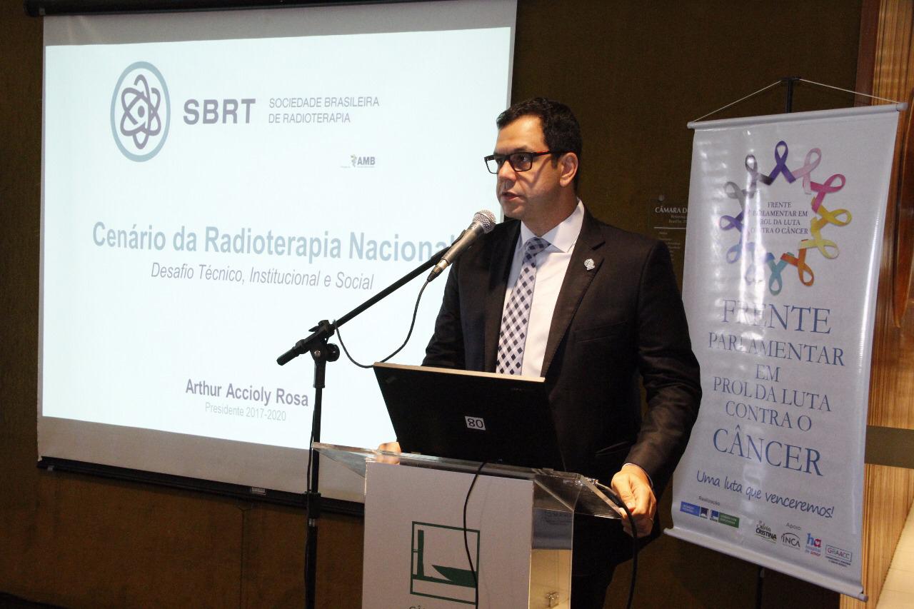 Em um evento direcionado a parlamentares, Dr. Arthur Rosa, Presidente da SBRT, apresentou informações sobre o desafiante cenário nacional da radioterapia, abordando aspectos de infraestrutura, custeio, tecnologia e recursos humanos.