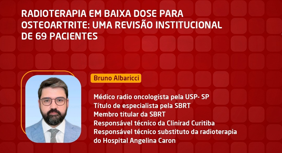 Estudo retrospectivo avaliou 69 pacientes (168 articulações) tratados com radioterapia de baixa dose (LDRT) para osteoartrite entre janeiro e dezembro de 2023. Tratados com 3 Gy em 6 frações (0,5 Gy/fração) em 2–3 semanas. A dor foi medida por escala numérica (0–100 total; 0–10 relevante) pré-tratamento (pré-RT), fim do tratamento (EOT) e seguimento de 10 semanas (FU). A média da
